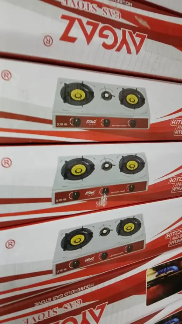موقد غاز منزلي من ماركة آيغاز (AYGAZ)، يتميز بجسم من الفولاذ المقاوم للصدأ وتصميم عملي للاستخدام اليومي. 3 رؤوس فونط شعلة الكترونية