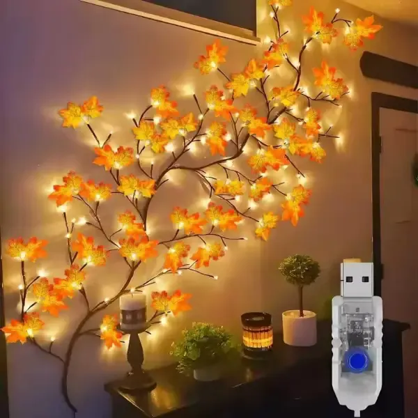 شجرة الخريف المضيئة أجمل قطعة ديكور للحائط مكونة من 72 ليد مضيء وأوراق خريفية باللون الأصفر والأورانج موزعة على 12 غصن مرن قابلة للطي والتشكيل حسب الرغبة مزودة بريموت كونترول للتحكم عن بعد يمكن من خلاله التحكم بشدة الضوء مع إمكانية التبديل بين 8 أنماط للإضاءة تعمل بالوصل المباشر بأي مأخذ USB ⭐️ طول الشجرة 1.5 متر ⭐️ طول سلك التشغيل 2 متر