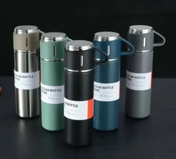 حافظة حرارة 500ml مع 3 فناجين ستانلس ستيل مقاوم للصدأ و الكسر مزودة بقفل داخلي للفتح و الإغلاق تحفظ الحرارة / البرودة حوالي 6 ساعات قطعة عملية بترافقك بكل الاوقات و هدية مثالية مع بكج مميز و أنيق الألوان { فستقي - زهري - شوكو }