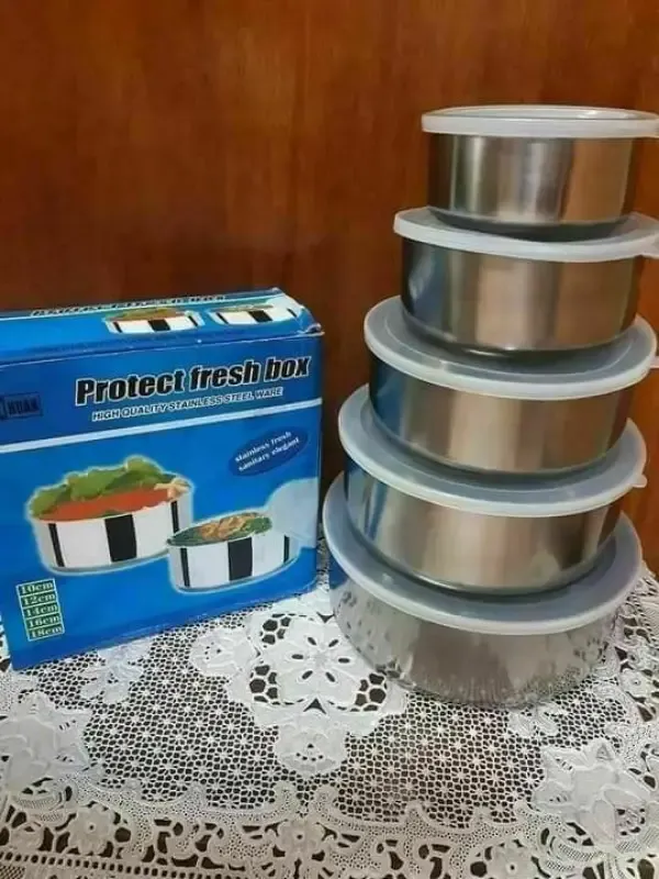 طقم تبروير 5 حافظات ستانلس {{ صغيرة }} مع أغطية بلاستيكية حافظة للحرارة ⭐️ مقاسات الحافظات 1⃣ القطر 18 سم - العمق 6.5 سم 2⃣ القطر 16 سم - العمق 5.5 سم 3⃣ القطر 14 سم - العمق 5 سم 4⃣ القطر 12 سم - العمق 4.5 سم 5⃣ القطر 10 سم - العمق 4 سم