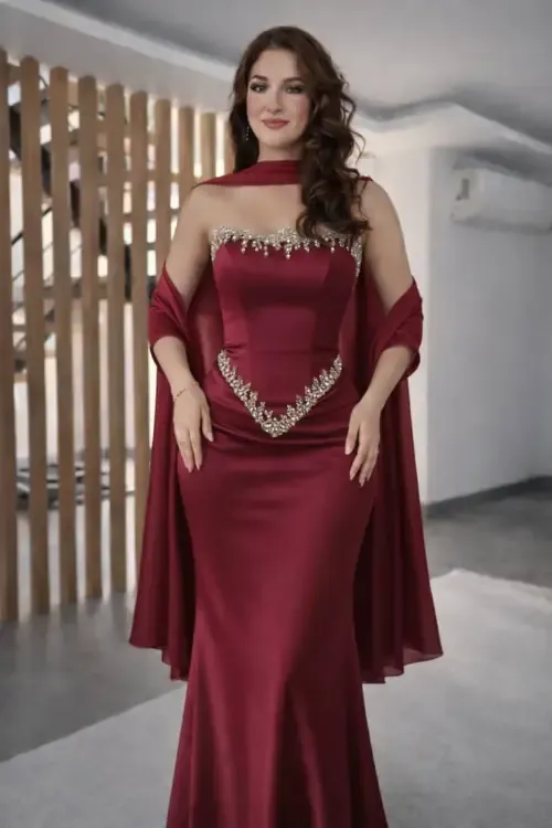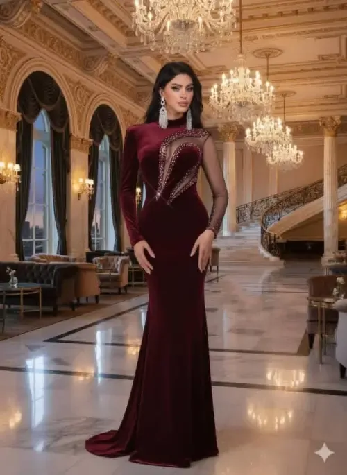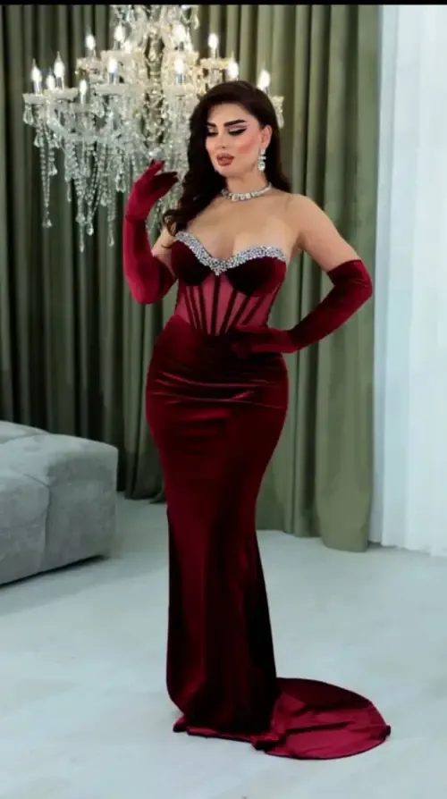 فستان مخمل + كفوف مخمل لزق حجر بلور كريستال اجنبي 1/2 /40/42/44/44 زيتي / خمري/ 👆🏻👆🏻
