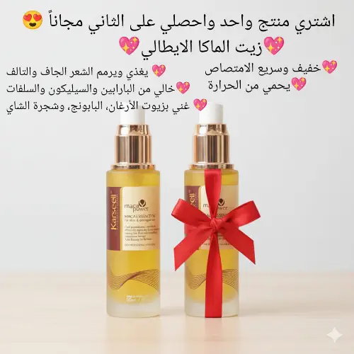 سيروم زيت كارسيل للشعر الاصلي... Karssel.... 🥰 ✔️يحتوي على زيت الماكا للعناية و لاستعادة الحيوية وتعزيز صحة الشعر و معالجة تقصفات الشعر ✔️يعمل على منع تساقط الشعر ويعمل على تكثيفه ✔️يعطي لمعان ونعومة للشعر اشتري قطعة والتاانية مجاناا🎁🎁🎁