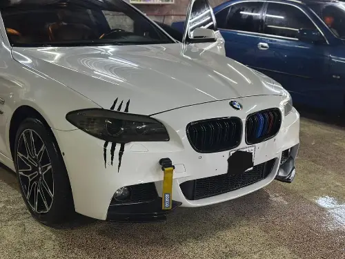 بي ام 520i كيت ام فايف لون ابيض داخلية زعفراني وخشب بني و اسود اشطمان رياضي ستة سلندر بس مبخوخ قطعة بلاستيك بالبمبر الخلفي