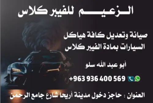 بسم الله الرحمن الرحيم #الزعيم للفيبر كلاس 🔥إليكم بعض ما نقدمه من خدمات السيارات: 📌صناعة وصيانة وتصميم كافة هياكل(السيارات،الشاحنات،الحافلات) 1-صيانة إهتراء الصاج بدون الحاجة للتصويج 2-صيانة قطع البلاستك وإكمال الأجزاء المفقودة منها 3-تصميم على حسب رغبة الزبون وإضافة قطع رياضية 4- صناعة صناديق توزيع منتجات حسب مقاس السيارة 🔥ولدينا الكثير من الخدمات الأخرى مثال: 📌صناعة وصيانة وتصميم كافة مليكان الألبسة 📌// // //ألعاب(مدن الملاهي،الروضات،المزارع،المسابح) 📌 // // // الأطراف الإصطناعية لزوي الأحتياجات الخاصة 📌 صيانة لكافة أجسام البلاستك والصاج مهما كانت... 🔥ميزاتنا 📌أسعار منافسة 📌السرعة في تلبية الطلب 📌شحن لجميع المحافظات السورية والبلاد( جملة ومفرق ) 📌 ((كفالة لجميع الأعمال والمنتجات لمدة عام من التلف)) نرحب بكم على مدار الساعة في مدينة أريحا عروس الشمال العنوان: حاجز دخول مدينة أريحا شارع جامع الرحمن تواصل معنا على الرقم التالي عبر واتس آب : أبو عبد الله سلو 963936400569+📞 توكلنا على الله وبه نستعين