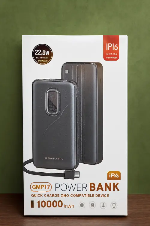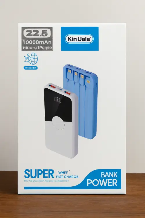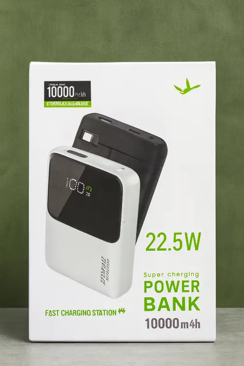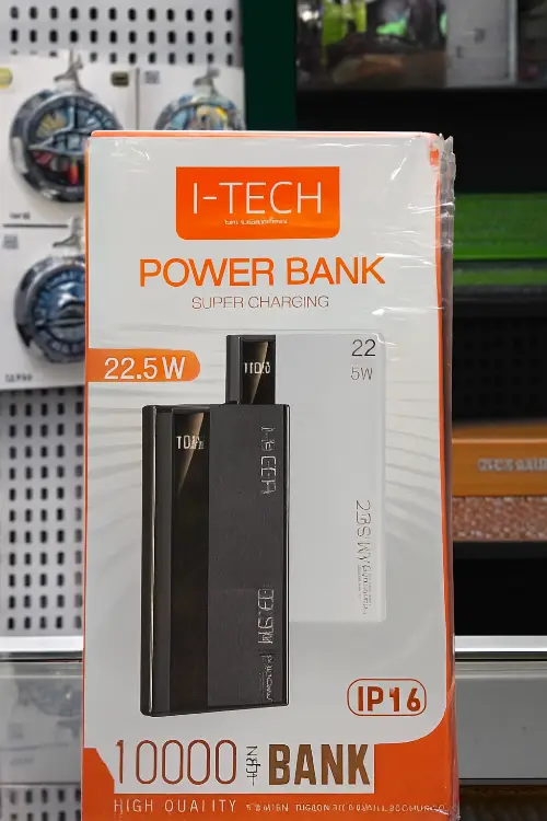 يتميز المنتج المعروض في الصورة بقدرة 10000 مللي أمبير في الساعة، مما يمكنه من شحن هاتف ذكي حديث بالكامل من مرة إلى مرتين. توضح العبوة أن الباور بانك يدعم الشحن السريع بقدرة 22.5 واط. الباور بانك مقاوم للماء والغبار بمعيار IP16، مما يجعله مناسبًا للاستخدام في الأماكن الخارجية. يمكن استخدام الباور بانك لشحن مجموعة متنوعة من الأجهزة مثل الهواتف الذكية والأجهزة اللوحية والسماعات اللاسلكية. يوجد توصيل لجميع أنحاء سوريا الدفع عند الاستلام السعر 75 الف