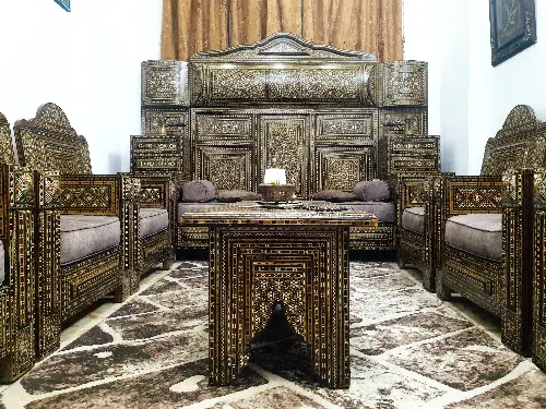 للبيع طقم دمشقي قديم موزاييك وصدف بحري طبيعي وموزاييك أصلي العدد ست كنبايات مفارد وديوان ملكي وطاولات للاستعلام 0995571166