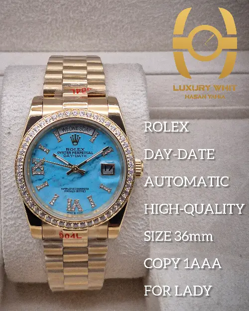 ROLEX DAY-DATE AUTOMATIC HIGH-QUALITY COPY 1AAA SIZE 36MM ساعة نسائية من رولكس الحركة اوتوماتيك ربط عداد شهري يومي مينا سيراميك حجر زيركون على إطار الساعة كامل الساعة ستانلس ستيل لون ثابت شعار الماركة على مفتاح وقفل الساعة مقاس : 36MM جودة عالية مع البوكس الاورجينال