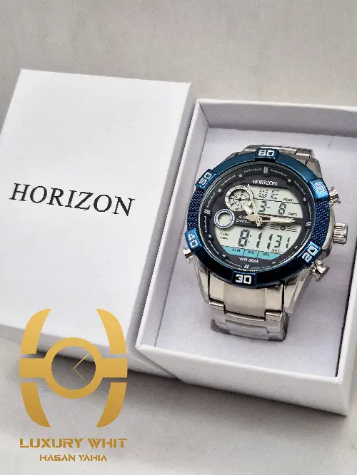 HORIZON DIGITAL DOUBLE TIME HIGH-QUALITY ساعة شبابية كامل الساعة ستانلس ستيل الحركة كوارتز شاشة دجيتال مع حركة عقارب عداد رياضي _ منبة _ تقويم شهري يومي _ ضوء led جودة عالية مقاس كبير مع علبة كرتون من الشركة